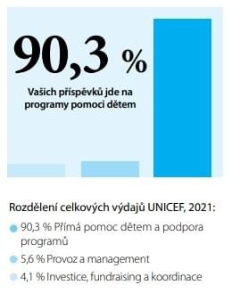 Práce Dětského fondu OSN je financována výhradně z dobrovolných příspěvků, přičemž na programy pomoci jde více než 90 % ze získaných prostředků (na obr. konkrétní údaje z roku 2021). Více informací v Přehledu roku 2022.